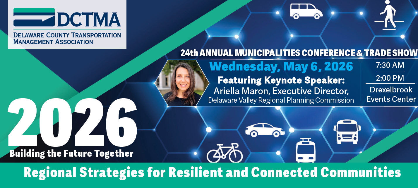 The DCTMA will be hosting the 24th Annual Municipalities Conference & Trade Show, titled Building the Future Together: Regional Strategies for Resilient and Connected Communities on May 6, 2026 at the Drexelbrook Events Center. We are pleased to welcome this year’s Keynote Speaker, Ariella Maron, Executive Director of the Delaware Valley Regional Planning Commission. This premier professional development and networking opportunity brings together municipal managers, elected officials, engineers, planners, emergency services personnel, transportation professionals, and local business professionals.
