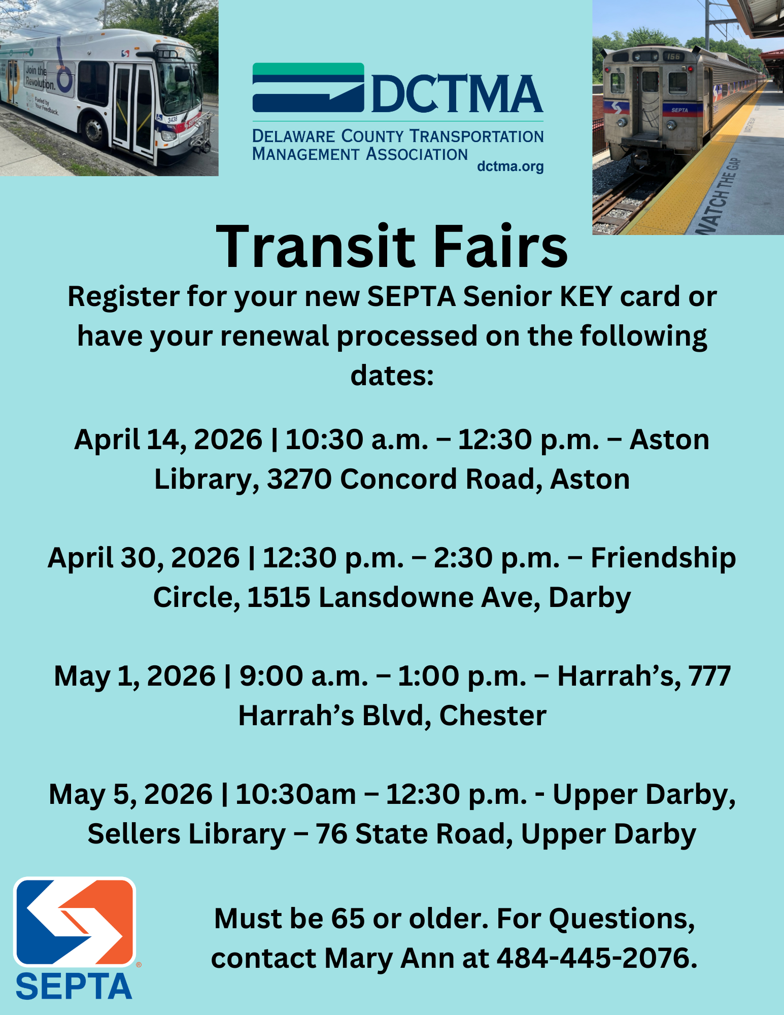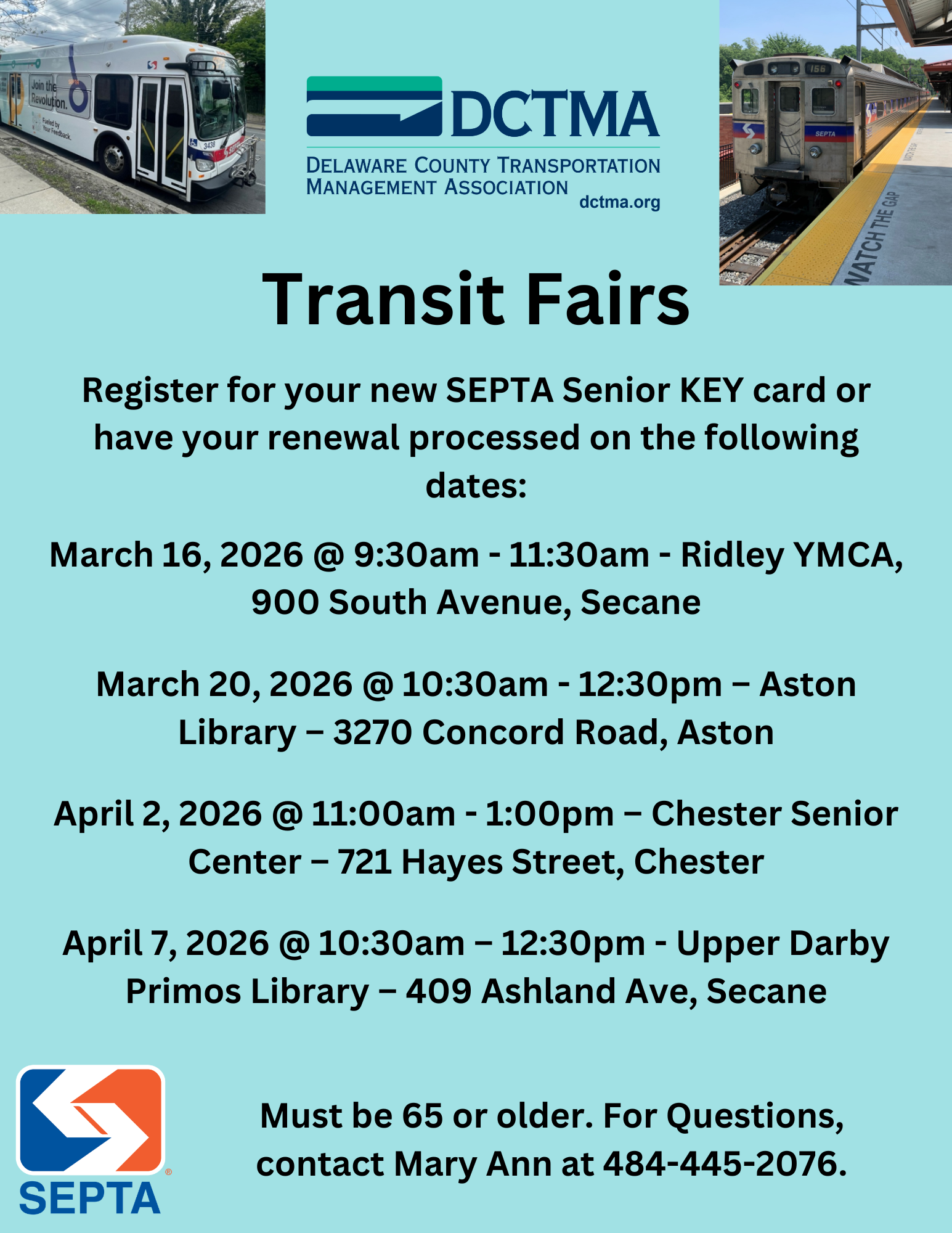 Any questions on SEPTA Senior ID cards, please reach out to Mary Ann Sandone at 610-892-9440, ext. #3.